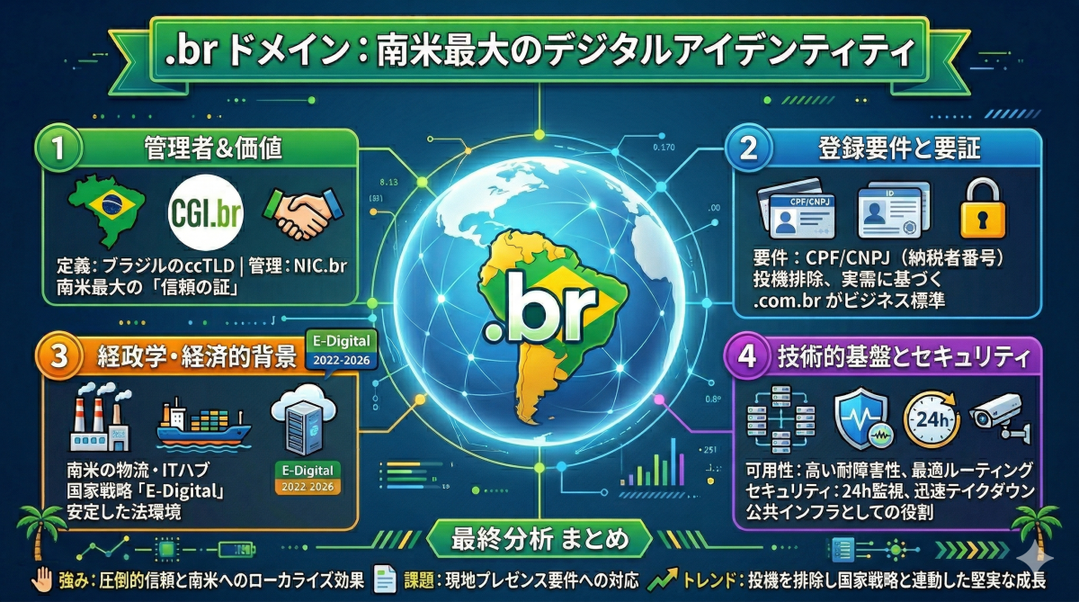 この地域密着型のアクセシビリティは、ブラジルが長年にわたり南米の経済を牽引し、ビジネスと人材のハブとして機能してきた「国内市場の保護と高い信頼性の維持」をそのまま反映したシステムと言えます。(※なお、ビジネス用途としては .com.br などのセカンドレベルドメイン構造が、ブラジル国内における標準的な選択肢として広く普及しています。)