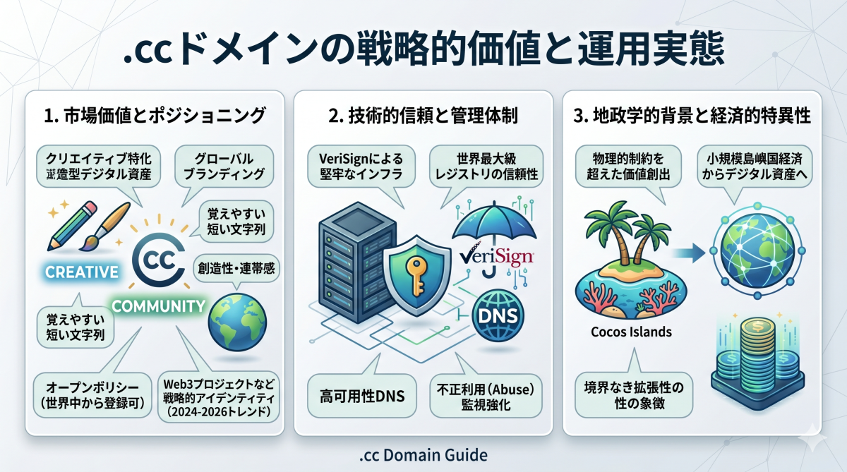 同団体の運用は、.cc を単なる地理コードとしてではなく、クリエイティブ系ブランドが自社の独創性やコミュニティ性を示すための識別子として市場に提供する方向に最適化されています。その結果、ポートフォリオサイト、クリエイターツール、ファンコミュニティ、Web3プロジェクトなど、創造的・トレンド志向の事業との親和性が高い拡張子として認知が広がりました。