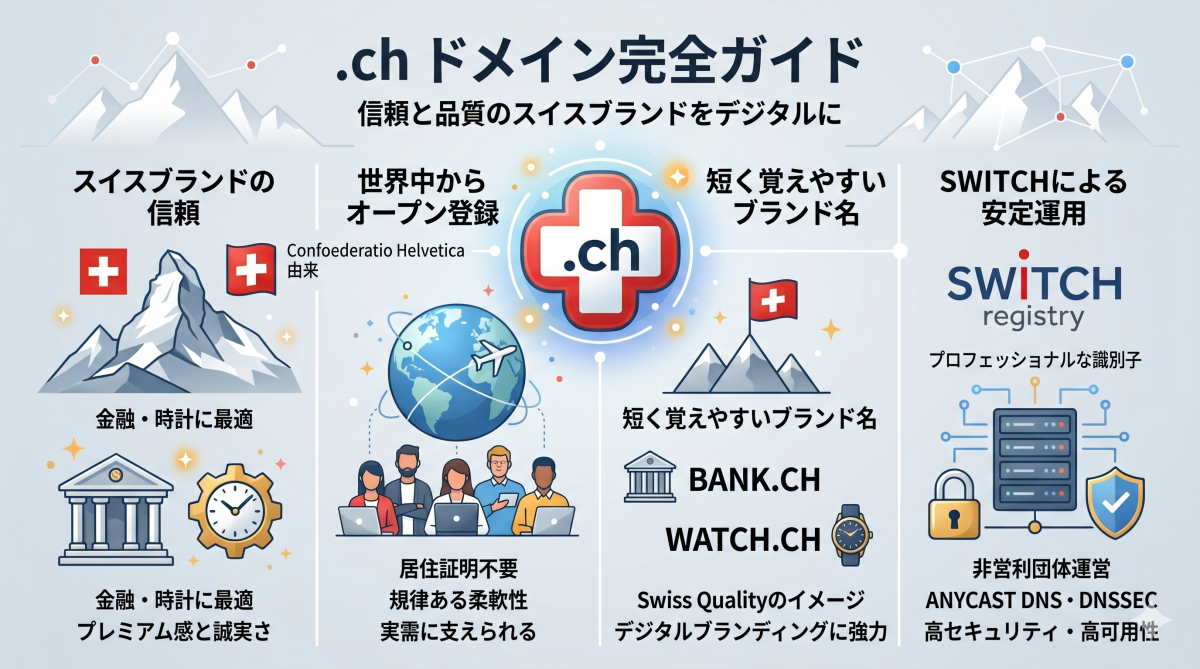 - .swiss ドメインとの明確な役割分担「.swiss」ドメインはスイス居住者や国内法人に厳密に限定された特別な拡張子です。これに対し、.ch は地理的制約なく取得可能なため、スイスに物理拠点を持たない日本の企業やグローバルクリエイターであっても、洗練されたブランディングを即座に実現できます。